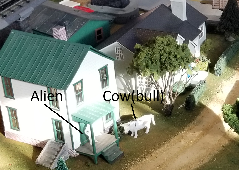 Where did the cow (Bull) land after jumping over the moon? By the house with the green roof and porch on the back right outside of the layout one house away from main street going under the trolley tracks