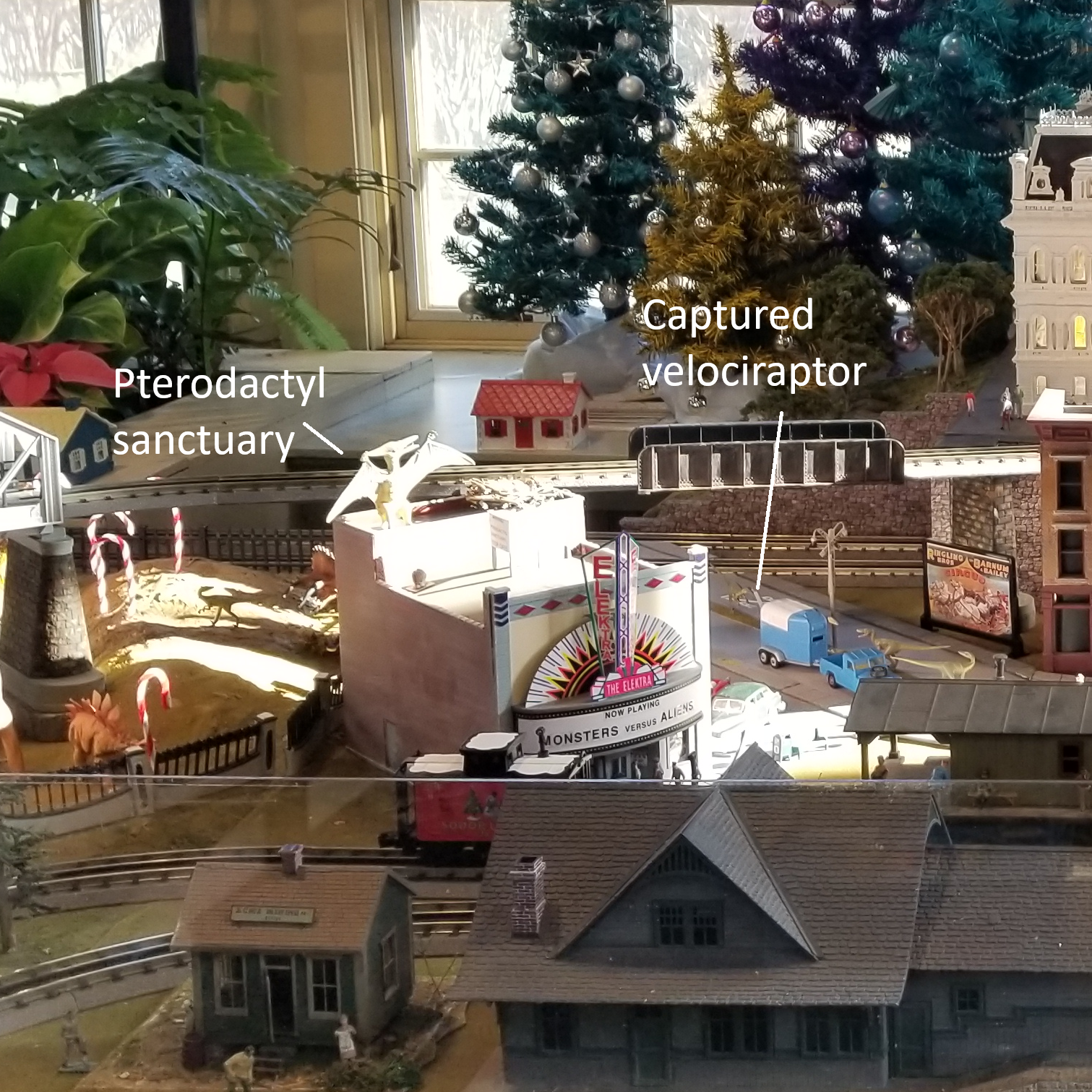 - Captured velociraptor – in white and blue trailer on the road behind the movie theater