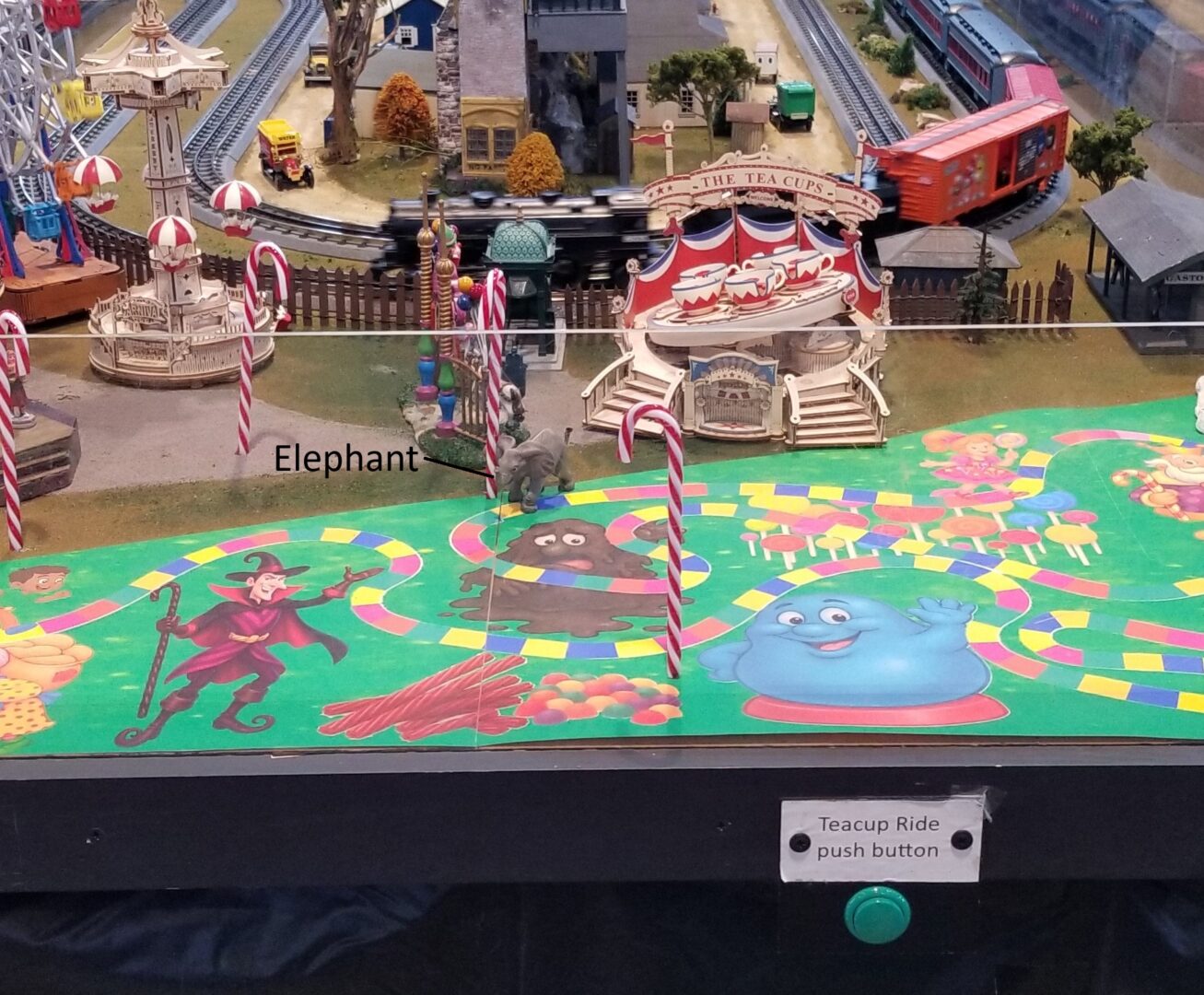 - Push-button for the Tea Cup ride – right end of the U, teacup ride seems to have a mind of its own sometimes pushing the button it doesn’t start wait a minute and try again